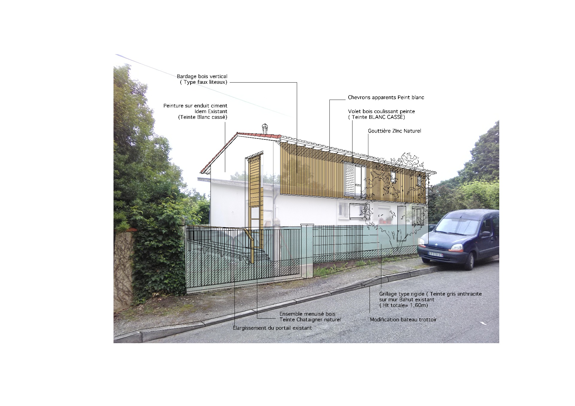 Le projet de surélévation double la surface habitable de cette maison en Rdc. Une solution mixte de mise en oeuvre avec murs en ossature bois pour les façades principales et murs maçonnés enduit pour les deux pignons a été envisagé pour une silhouette d'ensemble plus légère.