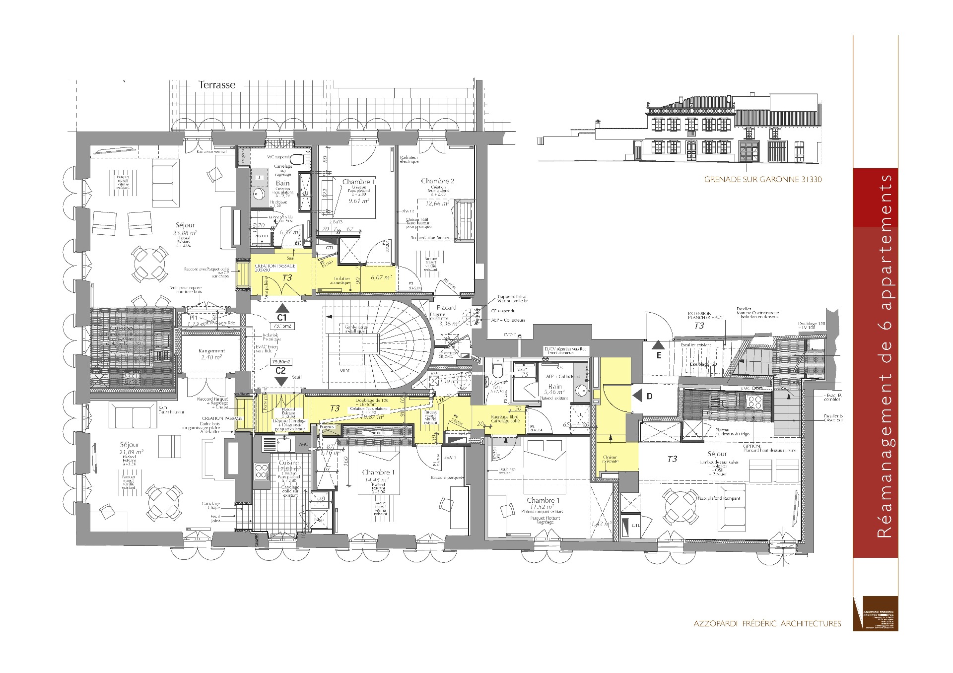 Une ancienne maison de maitre à Grenade sur Garonne 31330 est réaménagée en 6 appartements ( T3 et T2). Sont conservés les grandes hauteurs sous plafond, les boiseries principales, les cheminées de caractères et les parquets d'origine. Les façades ne sont pas modifiées. Le projet reprend à neuf l'ensemble des réseaux et raccordements depuis la rue.