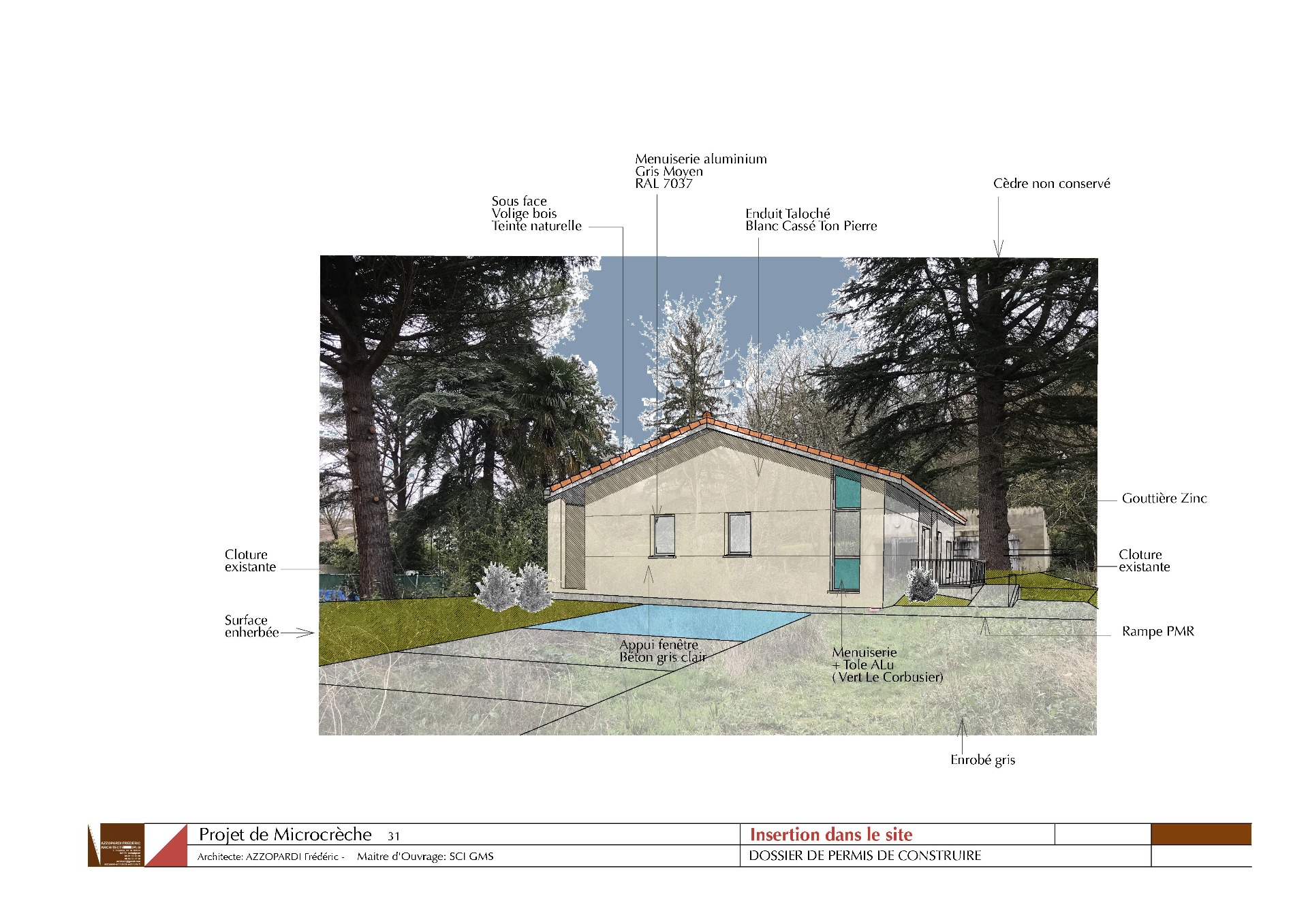 Située dans un ancien parc boisé, le projet de Microcreche accueillera 14 enfants. Le caractère public de cet équipement s'appui sur une qualification discrète du traitement d'angle et sur une aire de stationnement coté rue . Sur un terrain en pente et de 17m de large la construction s'implante en limite séparative de propriété afin de maintenir une perspective dégagée depuis l'entrée de la parcelle. Les travaux de terrassement et de nivellement sont limités pour une meilleure intégration du projet dans cette partie de coteau boisée.